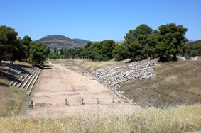 goed bewaarde stadion van de Pythische Spelen. Beneden het heiligdom