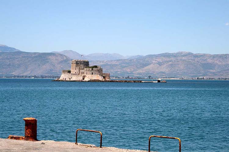 het vestingeiland Bourzi met een Venetiaans fort. Op de Akronafplia