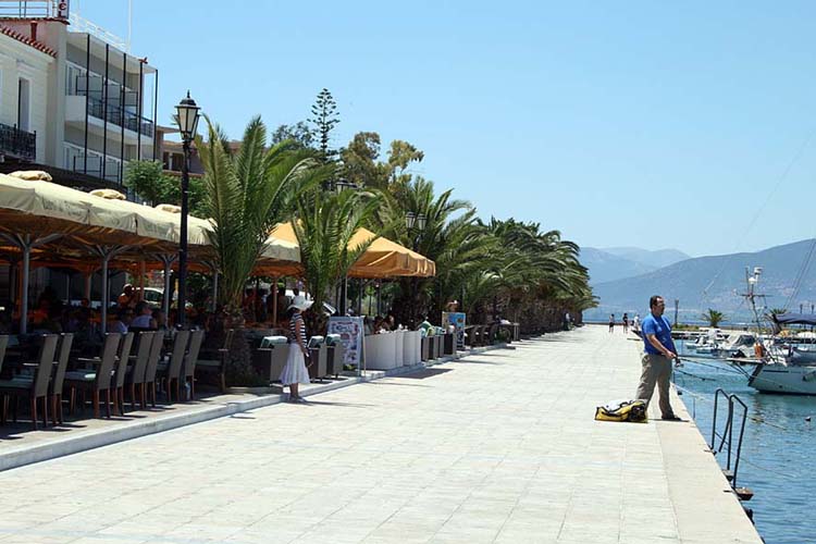 Nafplio. We staan aan het eind van het boulevardje, door de droge