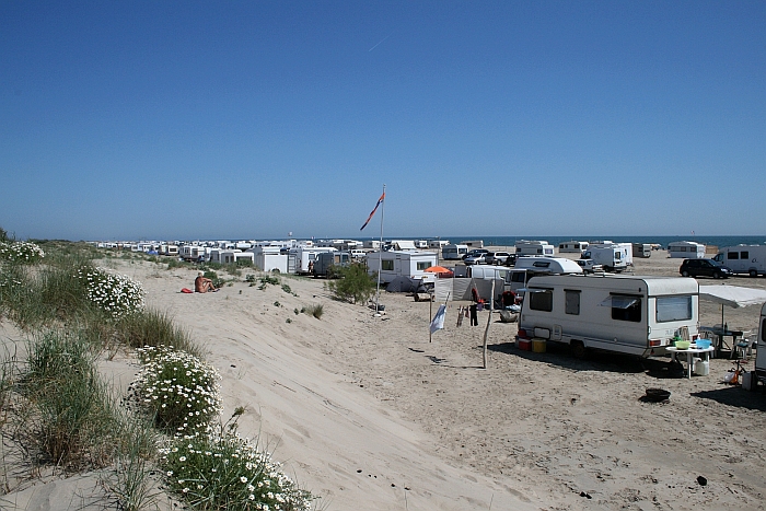 op en zover het oog reikt staan links en rechts caravans en campers